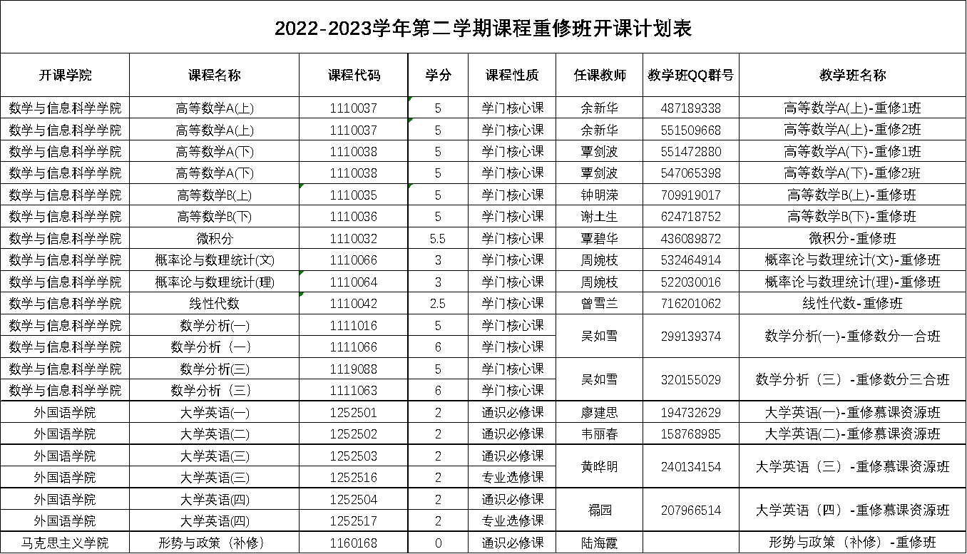 四、已选的重修课程,请同学们尽快加入课程教学班QQ群,以便接收任课教师的教学安排要求。附件1中未列出教学班QQ群的教学班仍在收集中,后续会更新公布。