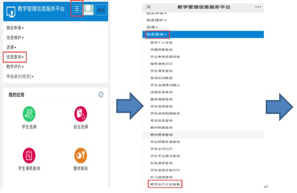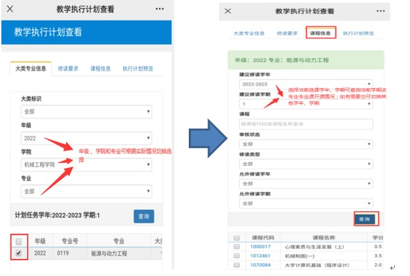 2.教务管理系统也可根据学年学期查询各专业每个学期的开课计划。具体查询方法:信息查询→教学执行计划查看→勾选年级、专业信息最左边的“□”→课程信息→输入“建议修读学年、建议修读学期” →单击“查询”。