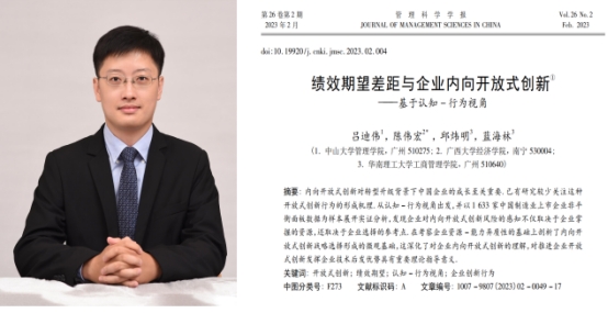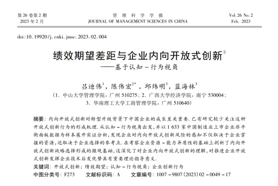 日前,我院陈伟宏老师与中山大学吕迪伟博士、华南理工大学蓝海林教授及邱炜明博士合作撰写的学术论文《绩效期望差距与企业内向开放式创新——基于认知-行为视角》在《管理科学学报》2023年第2期正式发表。
