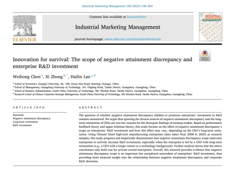 日前,我院陈伟宏助理教授与广东工业大学钟熙博士以及华南理工大学蓝海林教授合作撰写的学术论文“Innovation for survival: The scope of negative attainment discrepancy and enterprise R&D investment”(《为生存而创新:负向成就差异的范围与企业研发投资》)在《Industrial Marketing Management》(2023, 108: 190-204)正式发表。