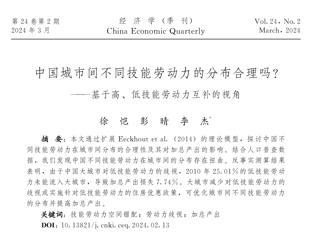 日前,我院彭晴助理教授与浙江大学经济学院徐恺副教授、暨南大学产业经济研究院李杰教授合作的论文“中国城市间不同技能劳动力的分布合理吗?——基于高、低技能劳动力互补的视角”在《经济学(季刊)》发表。