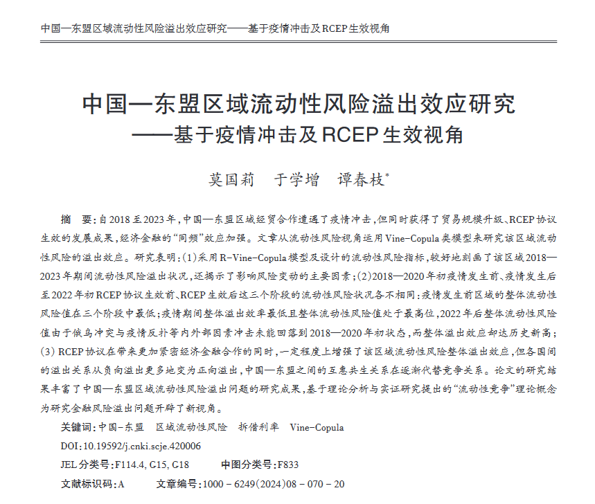 近日,我院莫国莉副教授、2020级应用经济学硕士研究生于学增、谭春枝教授(通讯作者)合作的论文《中国—东盟区域流动性风险溢出效应研究——基于疫情冲击及RCEP生效视角》在期刊《南方经济》发表。