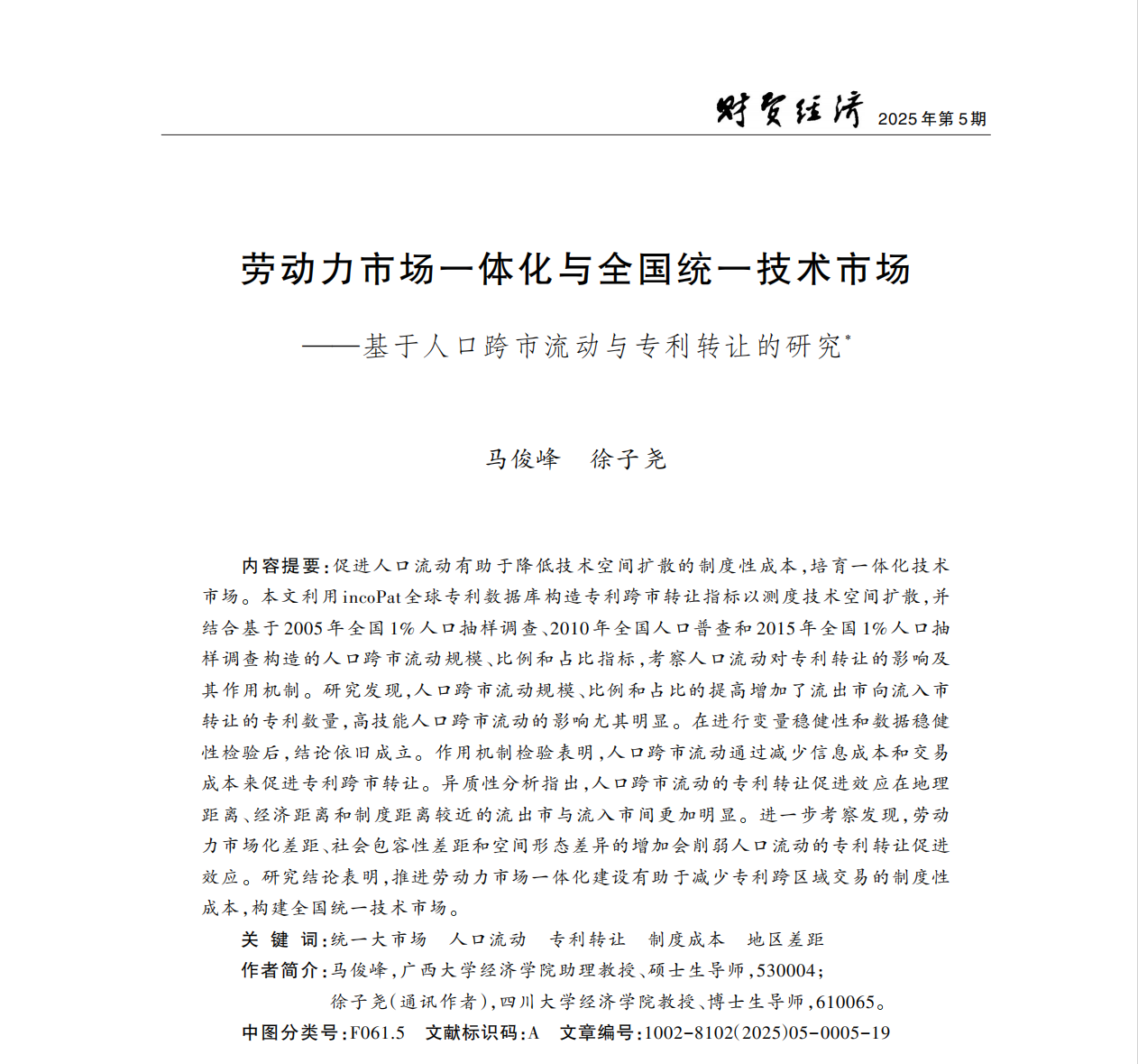 近日,我院马俊峰助理教授与四川大学经济学院徐子尧教授合作的论文“劳动力市场一体化与全国统一技术市场——基于人口跨市流动与专利转让的研究”在《财贸经济》期刊2025年第5期上在线发表。马俊峰助理教授为论文第一作者,徐子尧教授为论文通讯作者。本研究获得了教育部人文社会科学研究项目的资助。