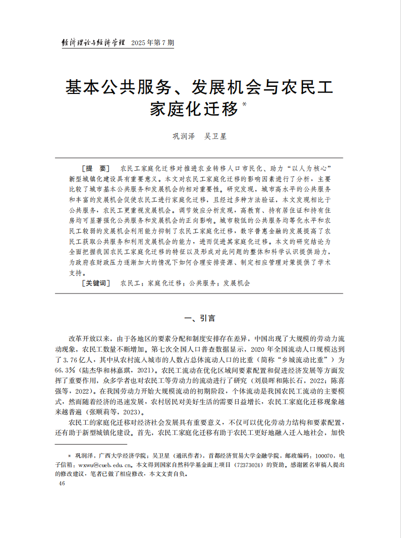 近日,我院助理教授巩润泽与首都经济贸易大学教授吴卫星合作的论文《基本公共服务、发展机会与农民工家庭化迁移》在《经济理论与经济管理》期刊2025年7月刊发表。
