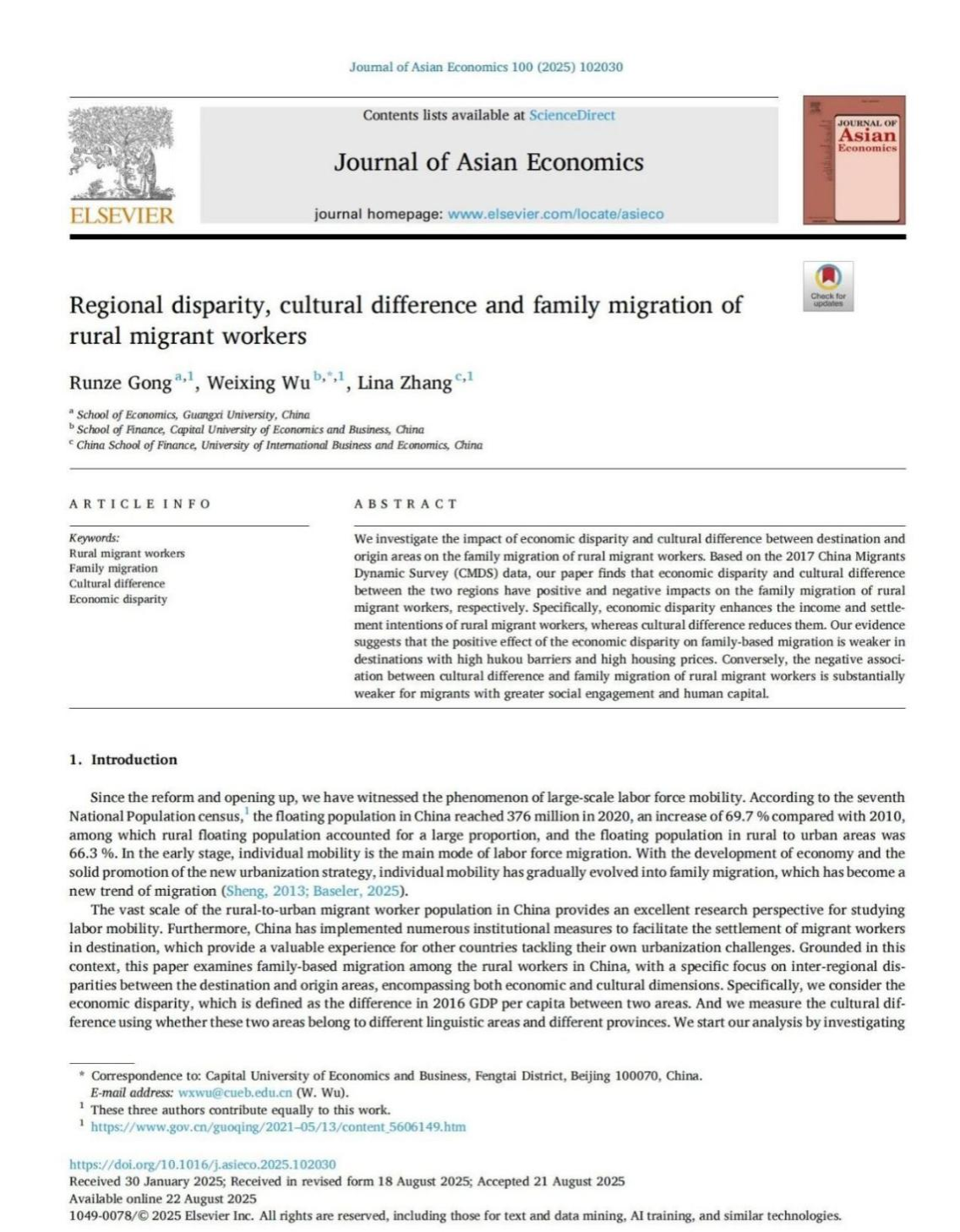 近日,我院助理教授巩润泽与其合作者共著的论文《Regional Disparity, Cultural Difference and Family Migration of Rural Migrant Workers》在《Journal of Asian Economics》期刊上发表。