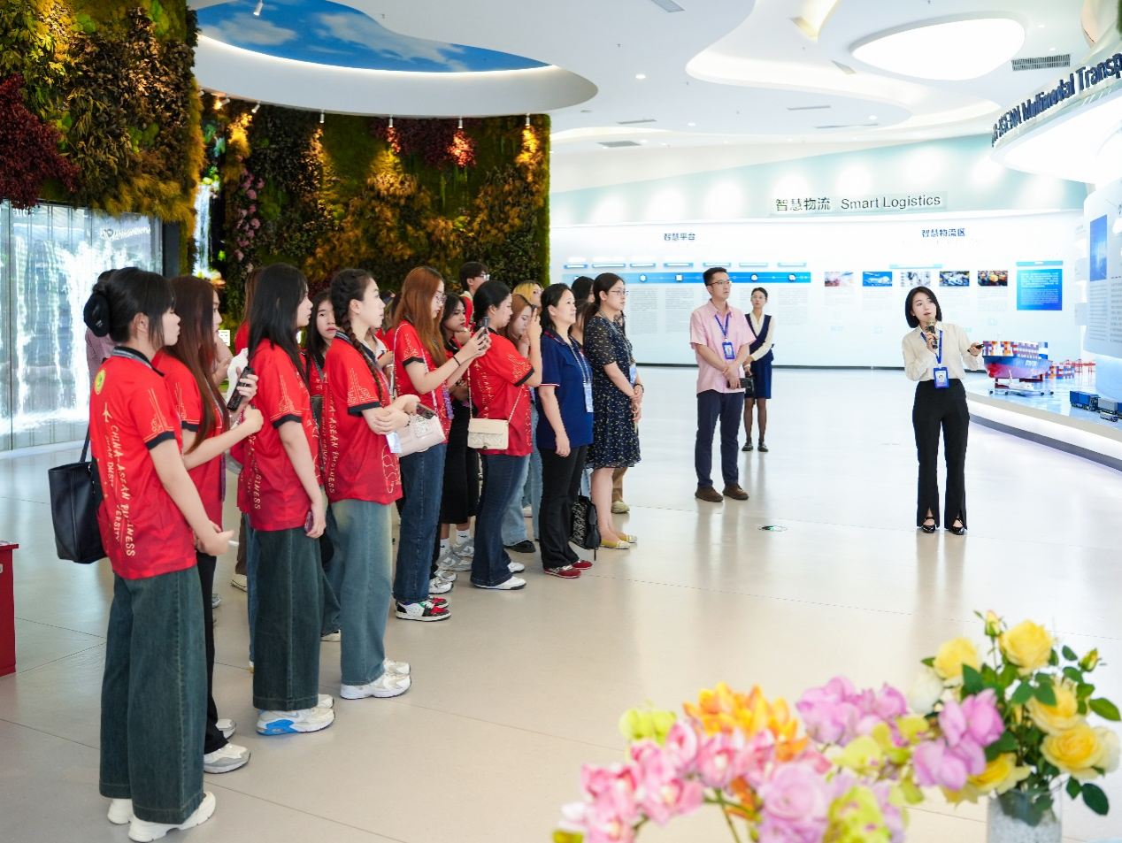 2025年6月3日,国际经济与贸易(中泰)学历班(简称国贸(中泰)班)2022级、2023级共25名同学在系副主任王玉洁副教授和班主任韦苏倢副教授的带领下,前往中新南宁国际物流园、靖佳科技数字化超级工厂及中国-东盟特色商品汇聚中心开展实地参观学习,深入了解现代物流产业的运营模式及区域经济发展实践。本次活动旨在推动专业理论知识与实际应用的结合,促进学生了解专业发展动态、拓宽视野、提升综合素质与实践能力。