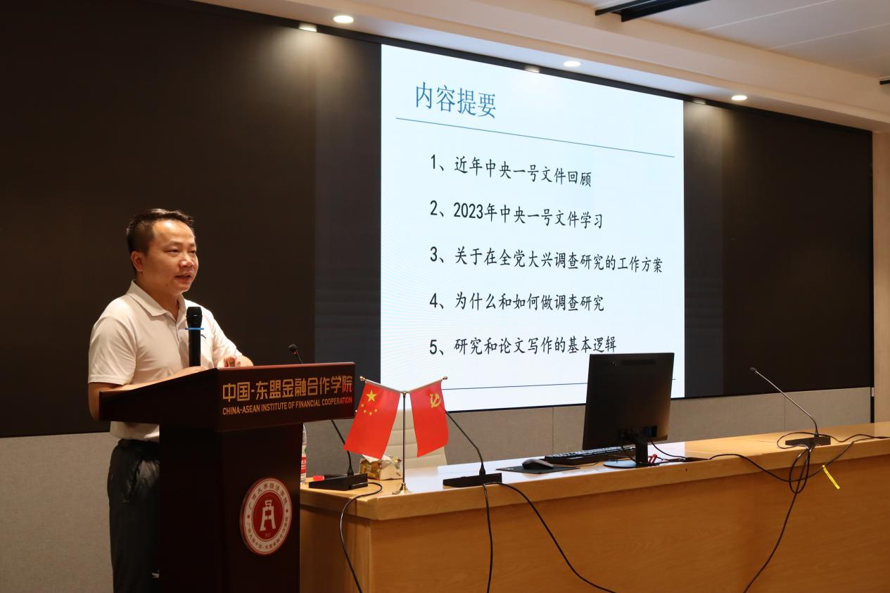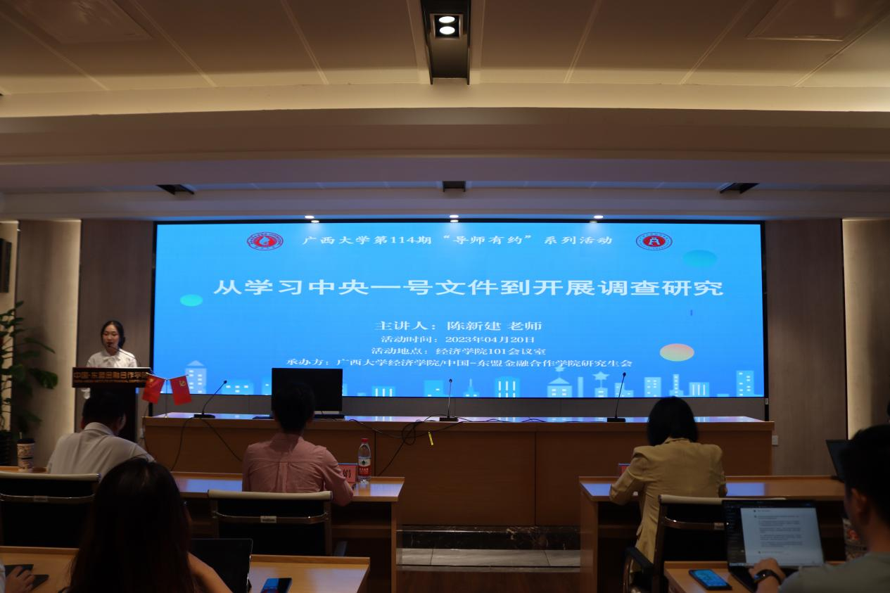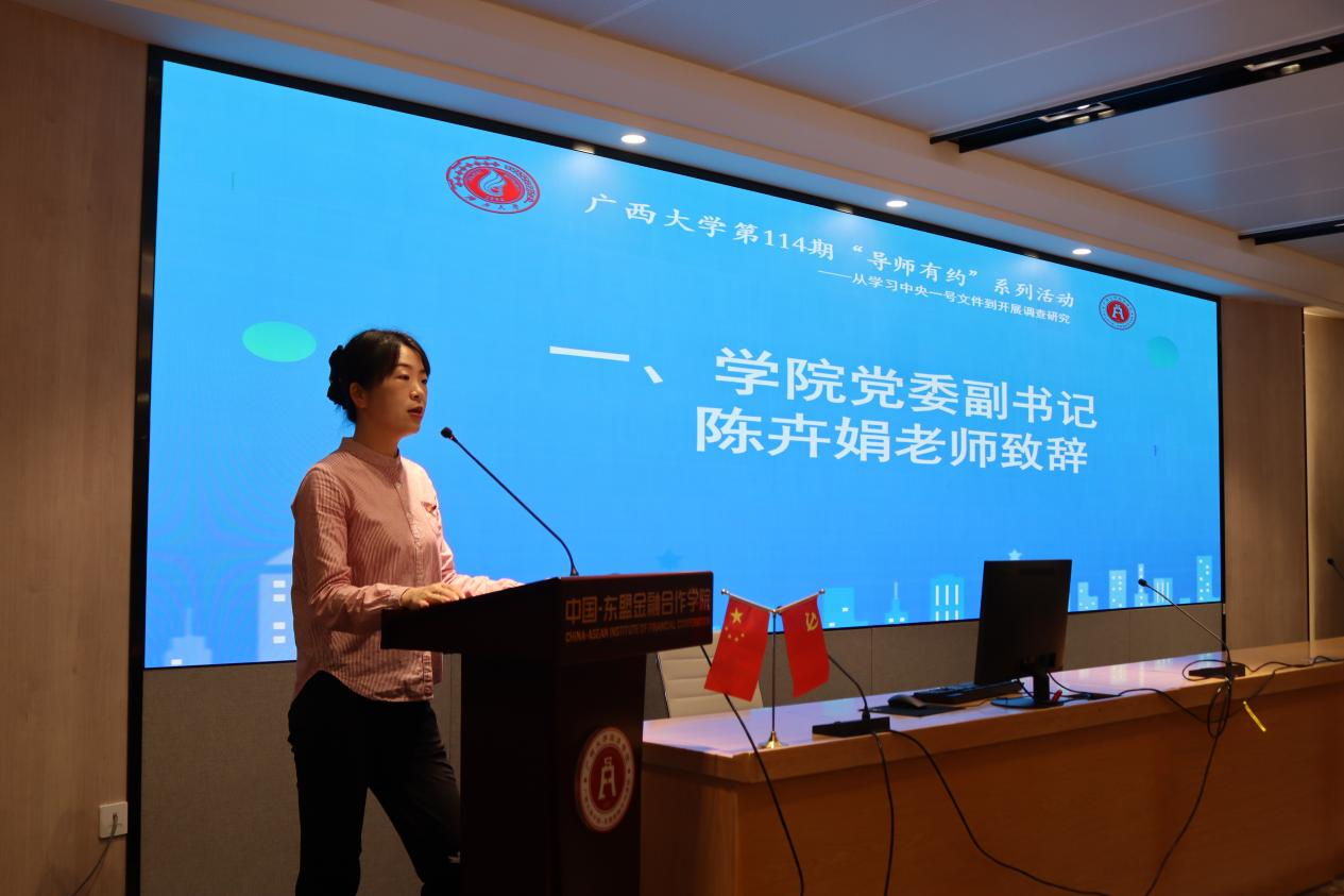 为深入学习贯彻习近平新时代中国特色社会主义思想主题教育工作会议,贯彻二十大推进高质量教育体系要求,响应我校“双一流”建设精神,4月20日晚上19:30,我院第一期“导师有约”暨英国上市公司365第104期系列活动在经济学院101教室举办。本次活动的主讲嘉宾是我院金融系副教授陈新建,主题为“从学习中央一号文件到开展调查研究”。学院党委副书记、纪委书记陈卉娟,团委书记王海希出席本次活动。
