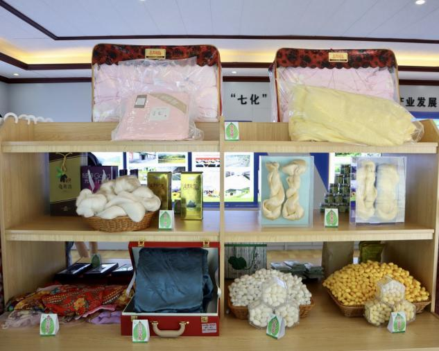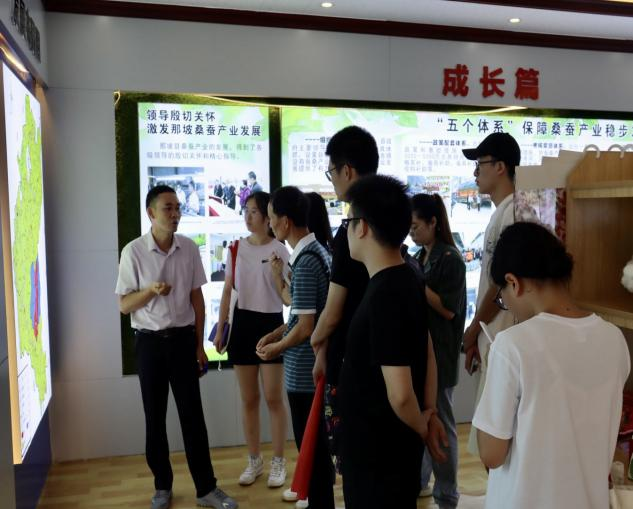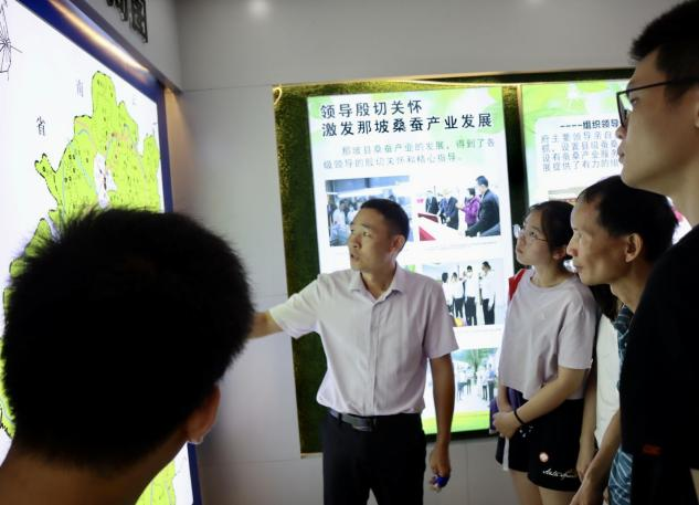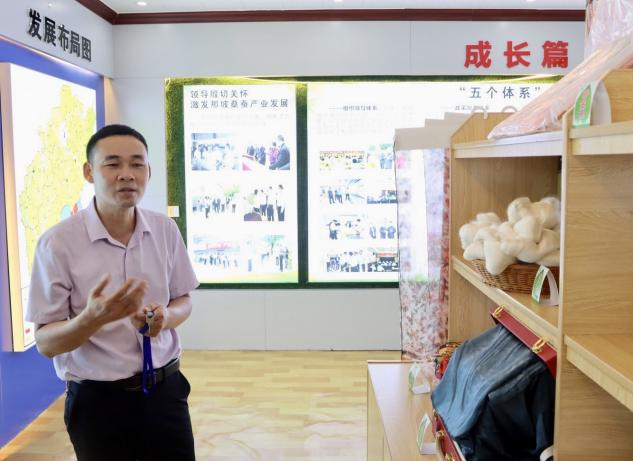 在黄书记的带领下,大家来到了“桑蚕展示厅”,黄书记为大家介绍了清华村在引入桑蚕产业后整个经济情况的变化,他们始终秉持“五个统一”的实践理念,坚持“拉长一根丝,做优一粒茧,开发一株树,盘活一片地,富裕一方人”的桑蚕产业发展目标。