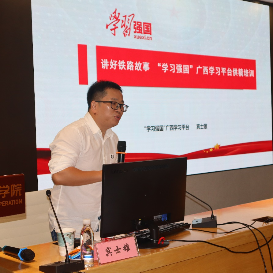 宾士雄老师在《讲好铁路故事——“学习强国”广西学习平台供稿特训》课程中介绍了学习强国平台,以及在平台上投稿的详细注意事项,鼓励宣传班骨干们积极投稿。