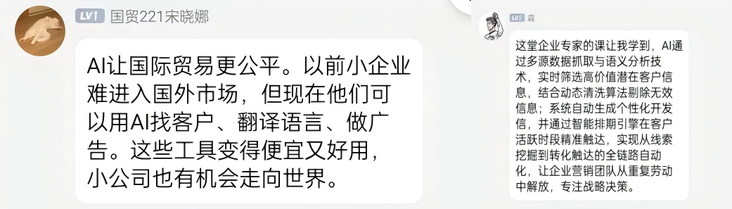 此次讲座为国贸学子们打开了AI数字营销的实践窗口,揭示了人机协同时代的核心竞争力——善用工具者重塑规则。本次校企联合授课将前沿技术融入课堂教学,不仅拓宽了学生的专业视野,更强化了理论与实践的结合,为培养适应人工智能时代的国际贸易人才提供了新思路。