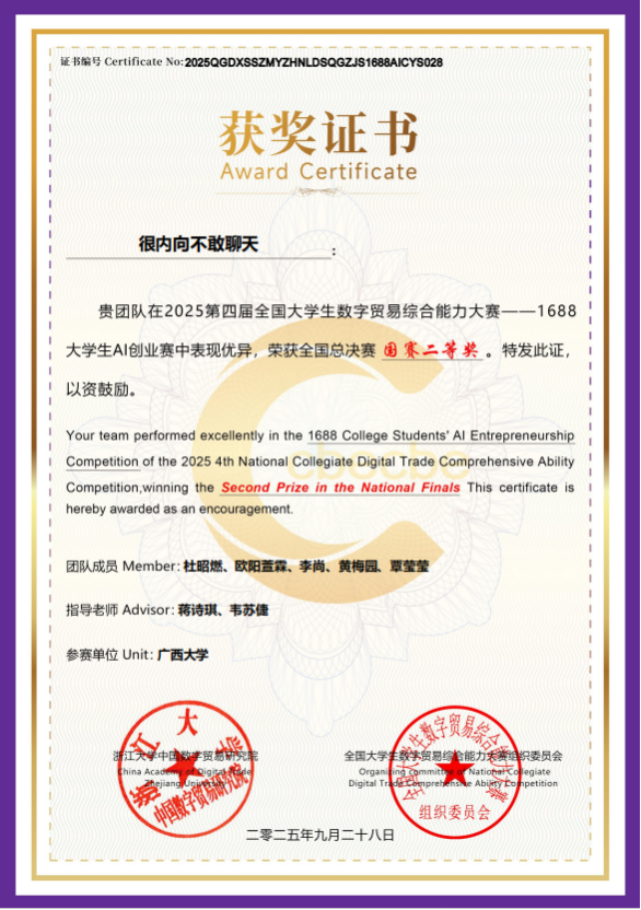 其中,1688大学生AI创业赛依托1688平台资源,聚焦轻创业。参赛团队以1688平台为供应链基础,开展轻创业(包括跨境电商卖家、内容电商创业者、私域店主等,创业平台不限)。本届1688大学生AI创业赛,吸引了来自31个省,近300所高校的1200支队伍报名参赛。最终,来自西安交通大学等78所院校的121支队伍入围全国总决赛!由我院蒋诗琪助理教授、韦苏倢副教授指导的“很内向不敢聊天”团队(成员包括24级国际商务专硕杜昭燃、欧阳萱霖、李尚、黄梅园、覃莹莹)表现卓越,一举夺得数字贸易大赛“1688大学生AI创业赛”全国总决赛二等奖和“1688数创之星”双项大奖!在这场代表中国大学生数字贸易最高水平的竞技中,我院团队一路披荆斩棘,凭借深厚的专业基础、出彩的方案设计与优秀的临场发挥赢得了评委的一致认可。