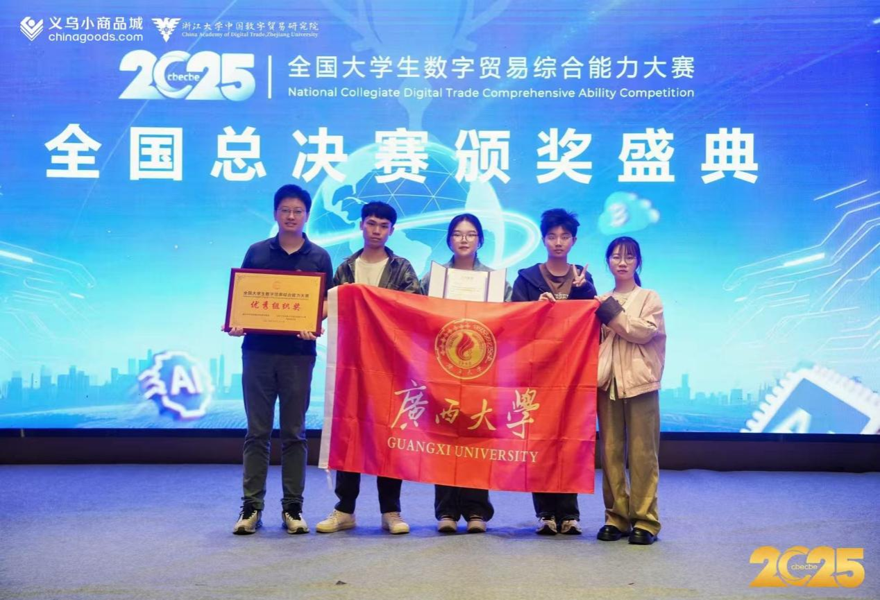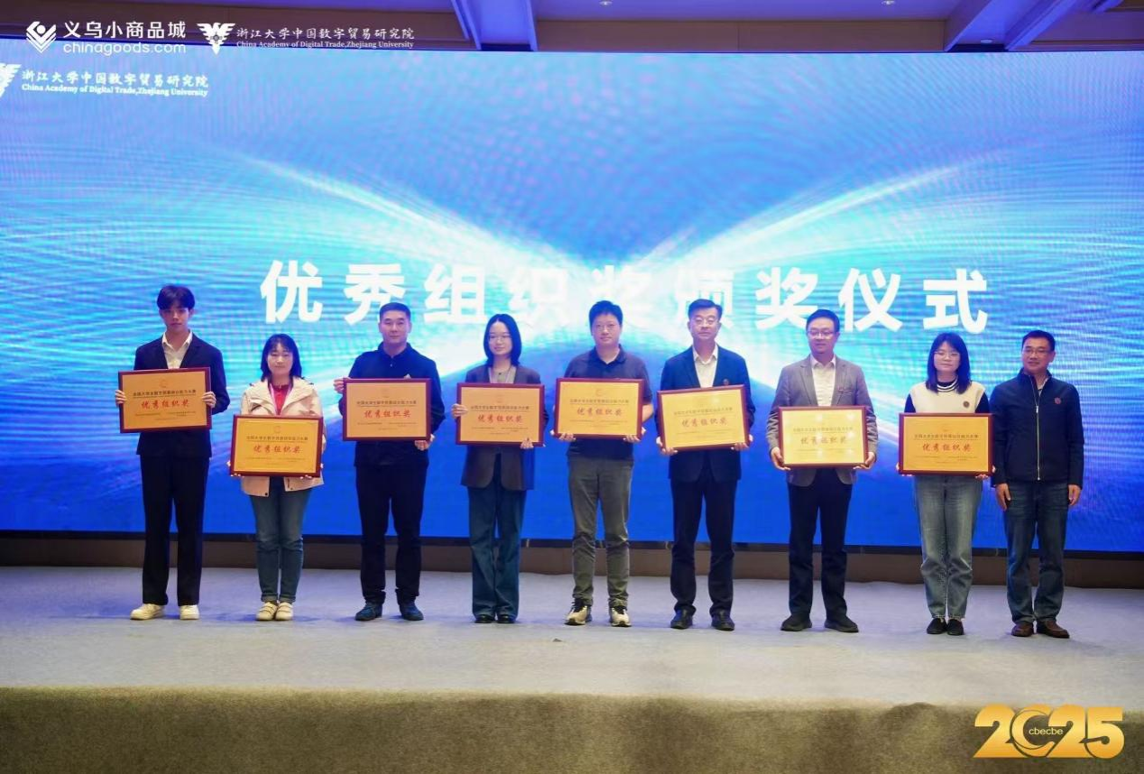 近日,2025年第四届全国大学生数字贸易综合能力大赛(简称“数字贸易大赛”)全国总决赛圆满落幕。经过初赛、省赛的激烈角逐,我院研究生团队“很内向不敢聊天”与本科生团队“醉把佳人成双队”凭借出色的表现从自治区级选拔赛中脱颖而出,成功晋级全国总决赛。在本届大赛中,我院代表队最终斩获了全国二等奖1项、三等奖1项、自治区级一等奖3项、二等奖5项、三等奖8项的优异成绩。其中,研究生团队“很内向不敢聊天”凭借出色的表现荣获“1688数创之星”单项奖。同时,我院荣获本次大赛的优秀组织奖!