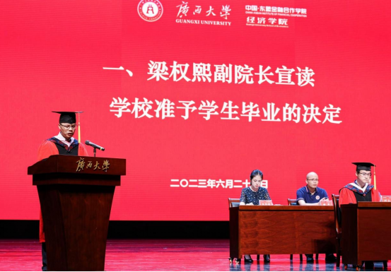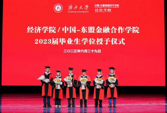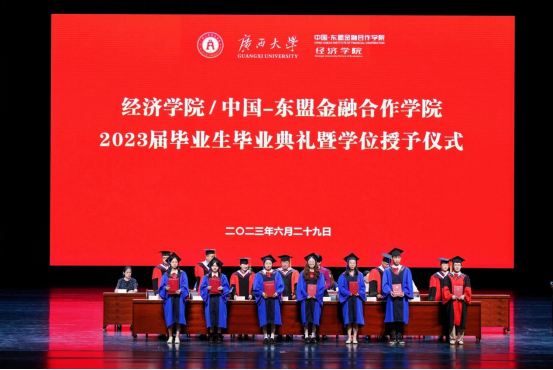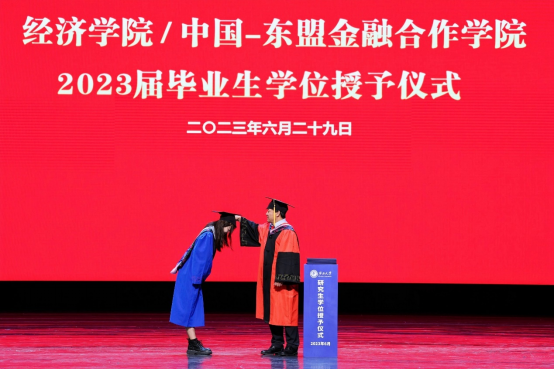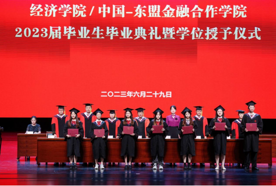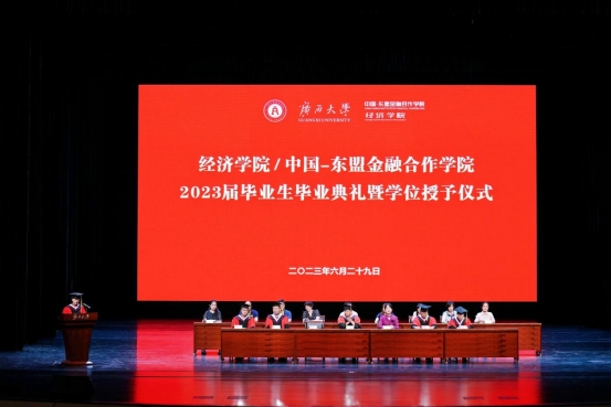 最后,全体师生齐声合唱校歌。在“勤恳朴诚,厚学致新,为祖国奋斗到底!”的嘹亮歌声中,英国上市公司365经济学院/中国-东盟金融合作学院2023届毕业典礼暨学位授予仪式落下帷幕。