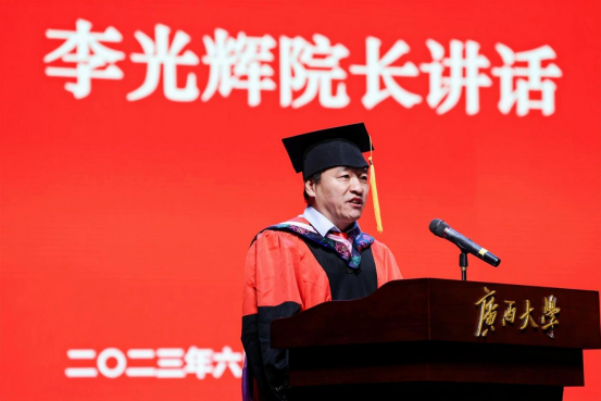 院长李光辉给我院全体2023届毕业生讲话。他对毕业生们提出三点期望:一要厚植家国情怀,勇担时代使命,自觉听从党和人民召唤,自觉扛起属于自己的责任,以实际行动践行“请党放心,强国有我”的青春誓言;二要坚持终身学习的信念,书写无悔人生,既读有字之书,也读无字之书,在实践中锤炼过硬本领;三要勇于追梦,敢于拼搏,在这个伟大的时代以奋斗姿态激扬青春,不负时代,不负年华。他希望同学们能在这个伟大的时代中乘风破浪,在百舸争流中勇立潮头,在实现中华民族伟大复兴的中国梦的进程中成就辉煌的事业!李院长表示,毕业生们的身份即将在这一刻由学子转变为校友,无论身在何处,学院永远是大家的坚强后盾和精神家园,学院的大门永远向大家敞开,欢迎常回家看看!