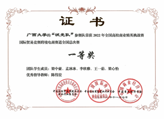 近日,2022年全国高校商业精英挑战赛国际贸易竞赛全国总决赛在线上成功举办。在学院的大力支持下,在国贸系王娟教授与陈伟宏助理教授的共同指导下,我院参赛团队在跨境电商赛道中斩获全国一等奖、在国际贸易业务模拟赛道中斩获全国二等奖。