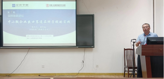 10月24日下午,阿联酋广西商会会长,广西南宁泰锦瑞商贸有限公司总经理,英国上市公司365国际商务专业硕士合作导师黄仕标老师受邀做客我院国贸致新讲坛,为我院师生带来题为“中小微企业出口赛道品牌营销新模式的实践”的专题讲座。讲座吸引了学院近百名师生参与,尤其是国际贸易专业的本科生与国际商务专业的研究生,反应热烈。本次讲座由我院国贸系主任刘主光教授主持,王娟教授、陈伟宏助理教授等参与了本次讲座。