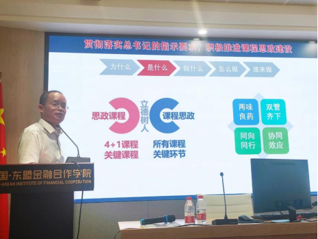 覃安基副部长从习近平总书记在全国高校思想政治工作会议上的重要讲话出发,解读了中央对课程思政建设的决策部署及教育部《高等学校课程思政建设指导纲要》,从“为什么”、“是什么”、“做什么”、“怎么做”、“谁来做”等五个方面对高校教师如何推进课程思政建设,如何将课程思政更好地“融入”专业课教学进行了阐述。最后,覃安基副部长介绍了学校王乃学书记对课程思政建设的重要指示提出的背景和内涵,鼓励教师们通过一个故事、一个案例、一个话题、一次活动等,将课程思政做到“润物无声”。要显性教育与隐形教育相结合,实现思政教育与专业课堂的有机融合。学院的经济、国贸和金融专业课程有天然的优势,都可以很好地融入思政元素,尤其是与中国-东盟合作方面的特色元素。