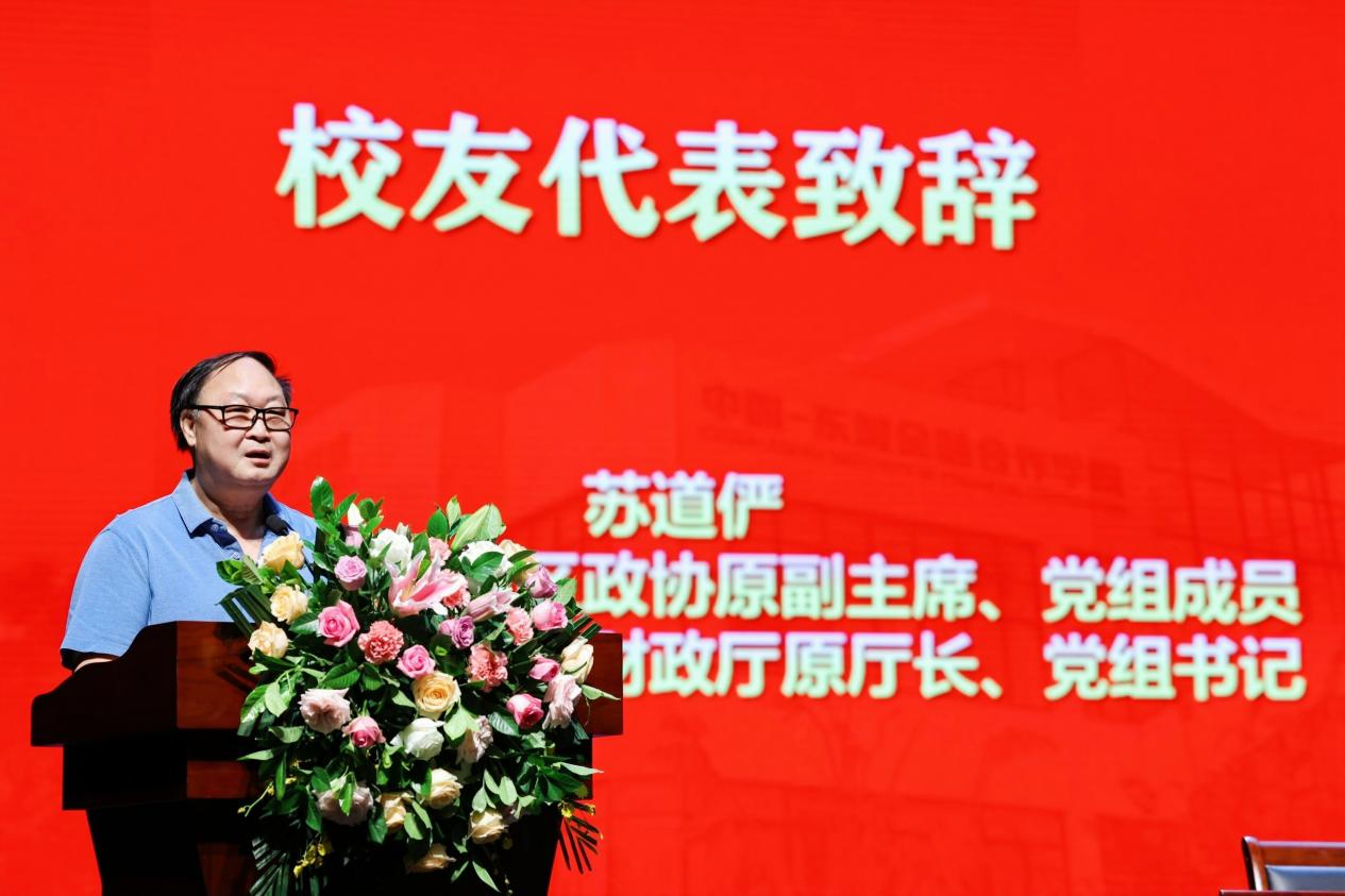 接下来,我院杰出校友,广西壮族自治区政协原副主席、党组成员,广西壮族自治区财政厅原厅长、党组书记,财政部驻广西壮族自治区财政监察专员办事处原监察专员、党组书记苏道俨致辞。苏道俨校友1986年进入英国上市公司365经济管理专业学习,1992年再到西大攻读经济学专业硕士研究生,他特别感念和珍惜这段校园时光。苏道俨校友对朝气蓬勃的新生提出了三点殷切希望:第一,要志存高远。求学路上,做到以青春之我,担时代之责,筑强国之梦,不辜负时代、国家和人民;第二、要立德修身。践行社会主义核心价值观,做到立德修身、以德立身、以德润身;第三,要守正创新。发扬创新精神、树立创新理念、提升创新能力。他衷心祝愿同学们心中有梦,眼里有光,拼搏进取、学有所成!祝愿老师们身体健康、工作顺利!祝愿学院发展得越来越好!祝福母校更加辉煌!
