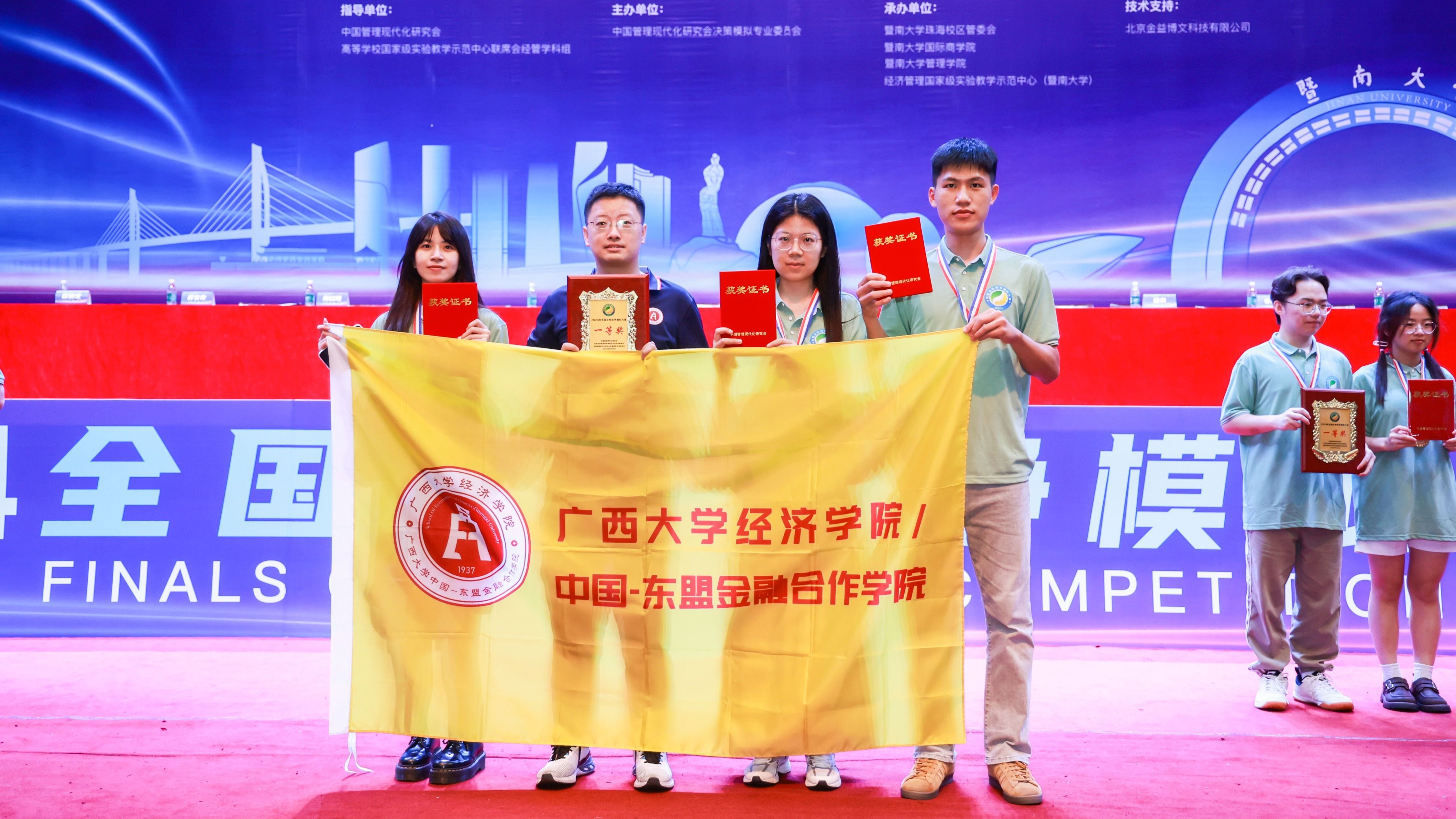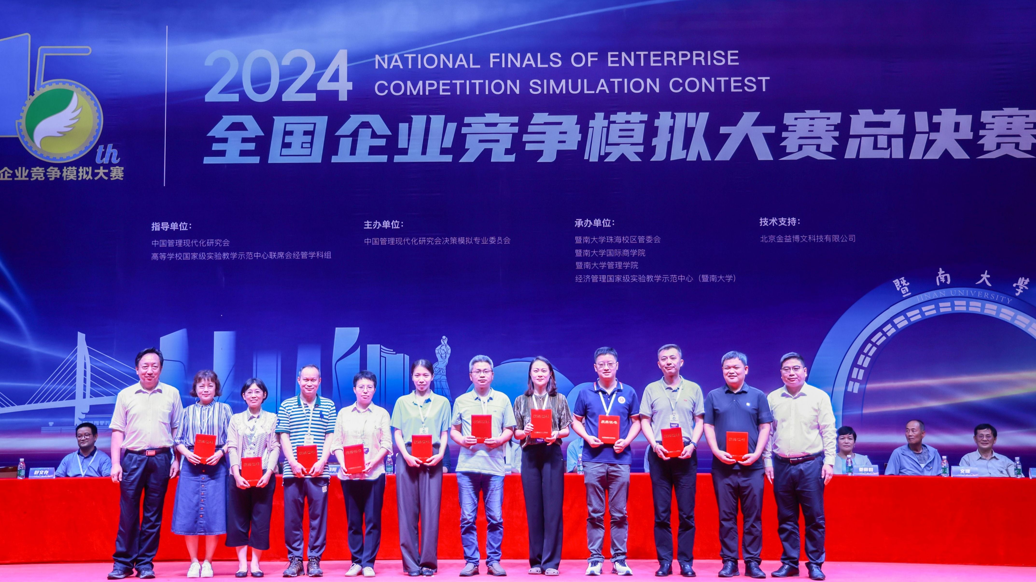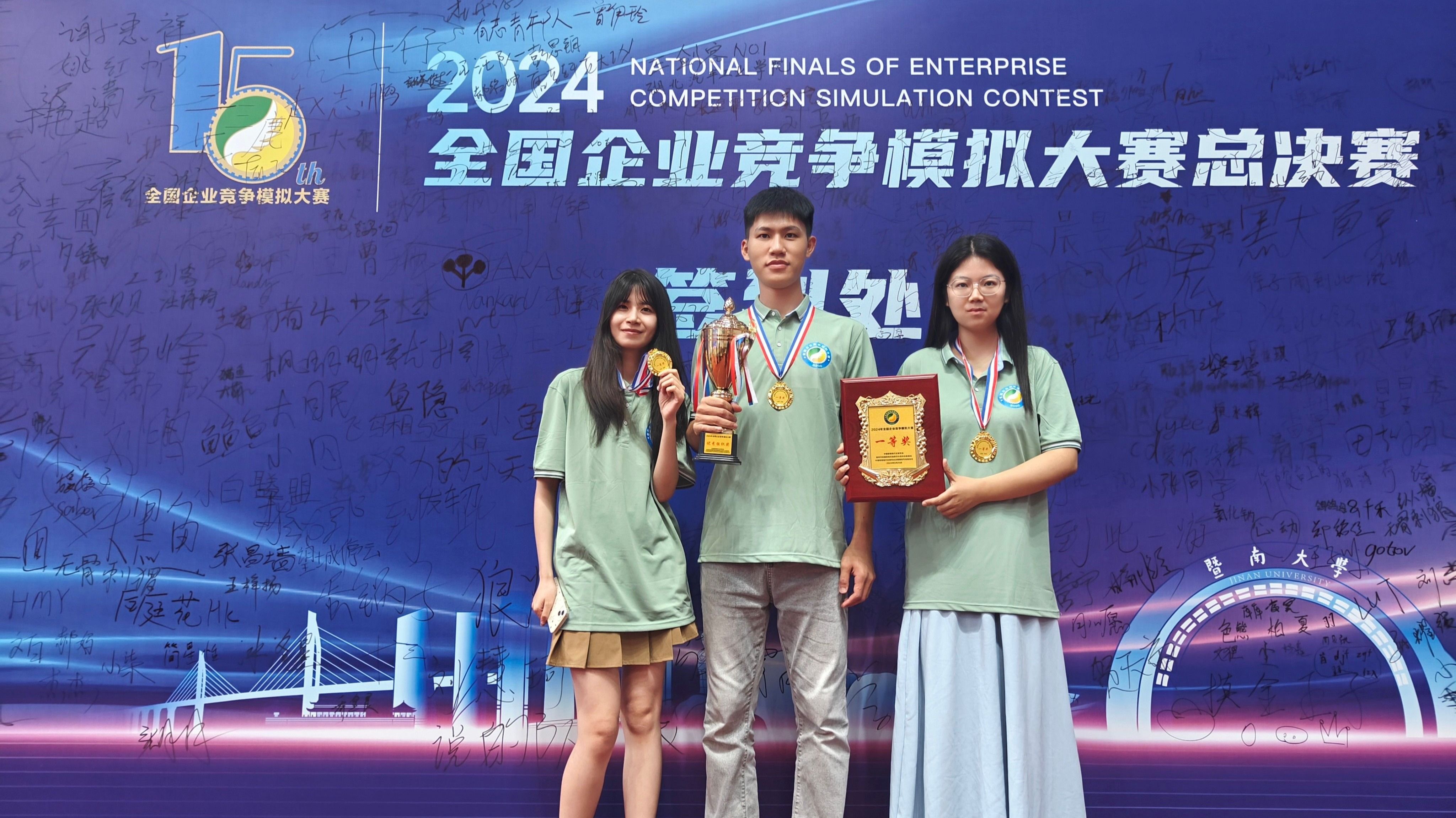 5月25日,2024年全国企业竞争模拟大赛总决赛在暨南大学珠海校区落下帷幕。在本届大赛中,我院师生力争上游,由吴维潼、徐嘉逸、张炜烽组成的“吴逸烽”代表队成功晋级全国总决赛并在“企业决策赛道”研究生组斩获赛事最高奖项(全国一等奖)。最终,我院代表队在本届大赛中荣获全国一等奖1项、二等奖2项、三等奖3项、优秀组织奖1项,我院教师陈伟宏副教授被评为优秀指导教师。
