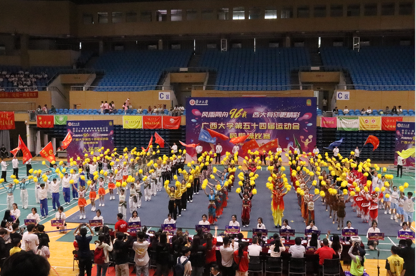 我院啦啦操代表队以整齐划一的队形,充满活力与创意的表演动作设计,赢得了现场评委老师们的认可。大家齐声高呼“经世济民,力争奋进;学通中外,时不我待”的口号,学院观众席上加油声、呐喊声此起彼伏,气势磅礴。