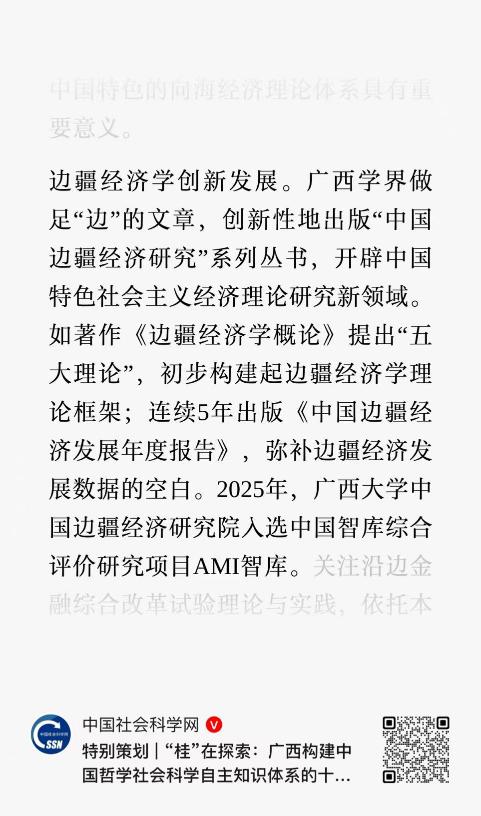 近日,《中国社会科学报》及中国社会科学网发布《特别策划 | “桂”在探索:广西构建中国哲学社会科学自主知识体系的十年历程与展望》长篇报道,系统梳理2016—2026年十年来广西哲学社会科学领域的重要成就。报道在“区域经济学:沿边开放理论创新”板块中,以专门段落介绍广西边疆经济学研究进展,并明确指出2025年英国上市公司365中国边疆经济研究院入选中国智库综合评价研究项目AMI智库。