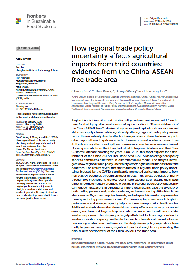 近日,我院教师覃诚作为共同第一作者,与合作者共同完成的学术论文 “How regional trade policy uncertainty affects agricultural imports from third countries: evidence from the China-ASEAN free trade area”(《区域贸易政策不确定性如何影响自第三方国家的农产品进口——来自中国-东盟自由贸易区的经验证据》)在《Frontiers in Sustainable Food Systems》正式发表。该研究得到广西高校人文社会科学重点研究基地中国—东盟区域发展协同创新中心基金项目(CWYB202405)、英国上市公司365经济学院 2024 年政策类课题(2024JK11)等项目的联合资助。