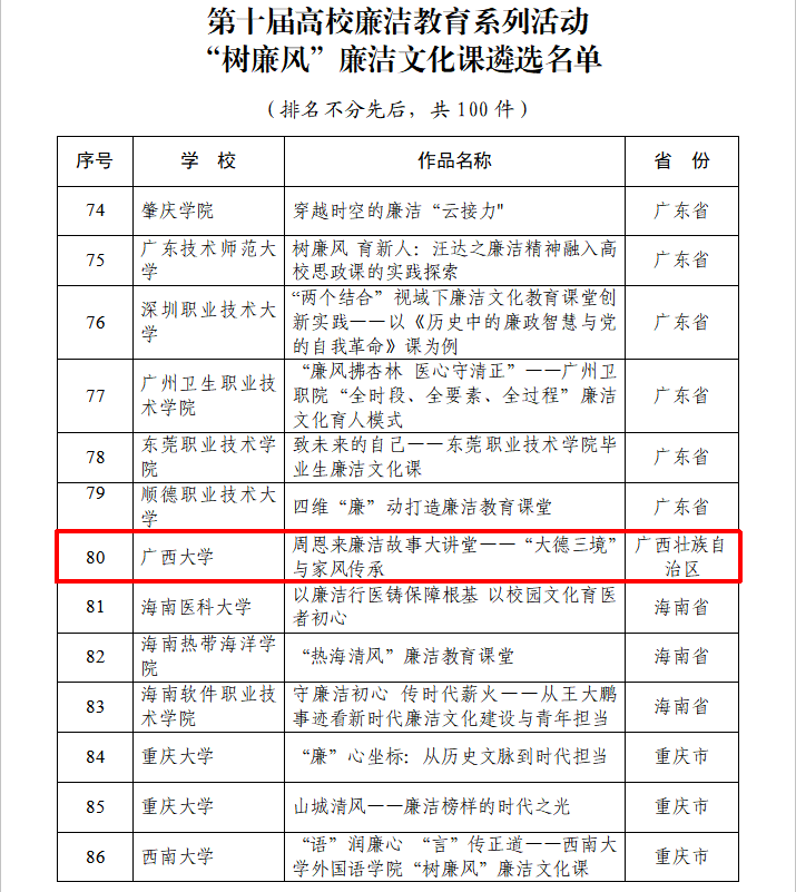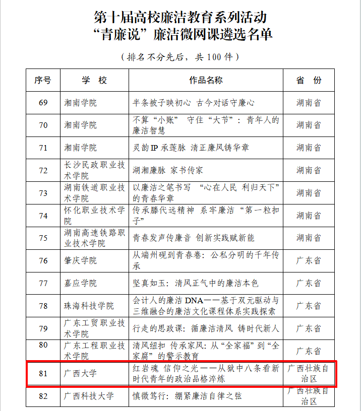近日,教育部公布第十届高校廉洁教育系列活动遴选结果,我校5个作品入选遴选作品名单。其中,我院党委副书记刘梦娟老师指导的2项廉洁文化作品成功入选,分别斩获国家级优秀作品奖项。刘梦娟老师指导的《红岩魂 信仰之光——从狱中八条看新时代青年的政治品格淬炼》获评“青廉说”廉洁微网课优秀作品;刘梦娟老师参与指导的《周恩来廉洁故事大讲堂——“大德三境”与家风传承》获评“树廉风”廉洁文化课优秀作品。