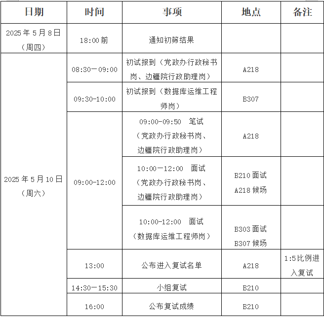 应聘者提交简历材料后,学院根据招聘条件对应聘者进行资格初审和初选。党政办行政秘书岗、边疆院行政助理岗通过笔试、面试、复试等程序进行。数据库运维工程师岗通过面试、综合考核等程序进行。