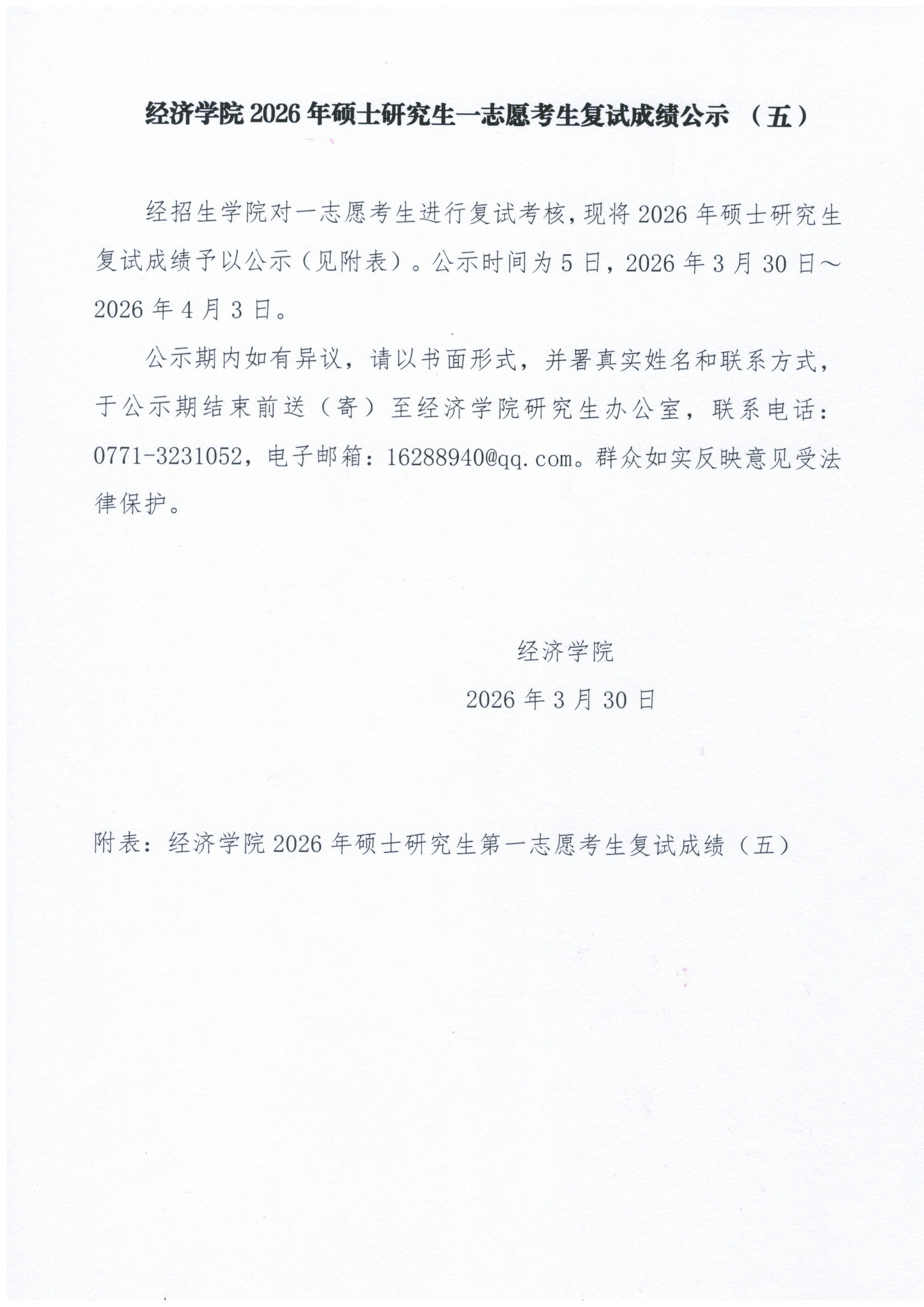 经济学院2026年硕士研究生一志愿考生复试成绩公示(五)