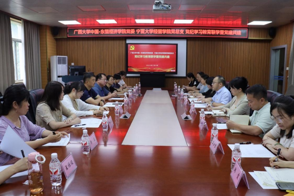 7月5日上午,我院党委与宁夏大学经济管理学院党总支在MBA大楼314会议室开展党纪学习教育联学暨党建共建活动。学院党委常务副书记罗诚,党委副书记、纪委书记陈卉娟,党委委员、副院长杨璞,各教工党支部书记及党员教师代表同宁夏大学经济管理学院党总支书记赵军,教育与社会学部党委副书记、副部长房彦兵,经济管理学院党员教师代表等20余人进行座谈交流。罗诚主持座谈交流活动。